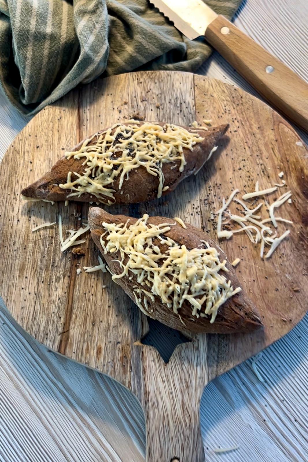 - Hornea en el HORNO o en la AIRFRYER: Antes de hornear, pulveriza con un poco de agua los panes y espolvorea QUESO RALLADO (nosotros hemos usado Emmental) y si quieres también algunas semillas que te gusten (nosotros hemos puesto amapola).